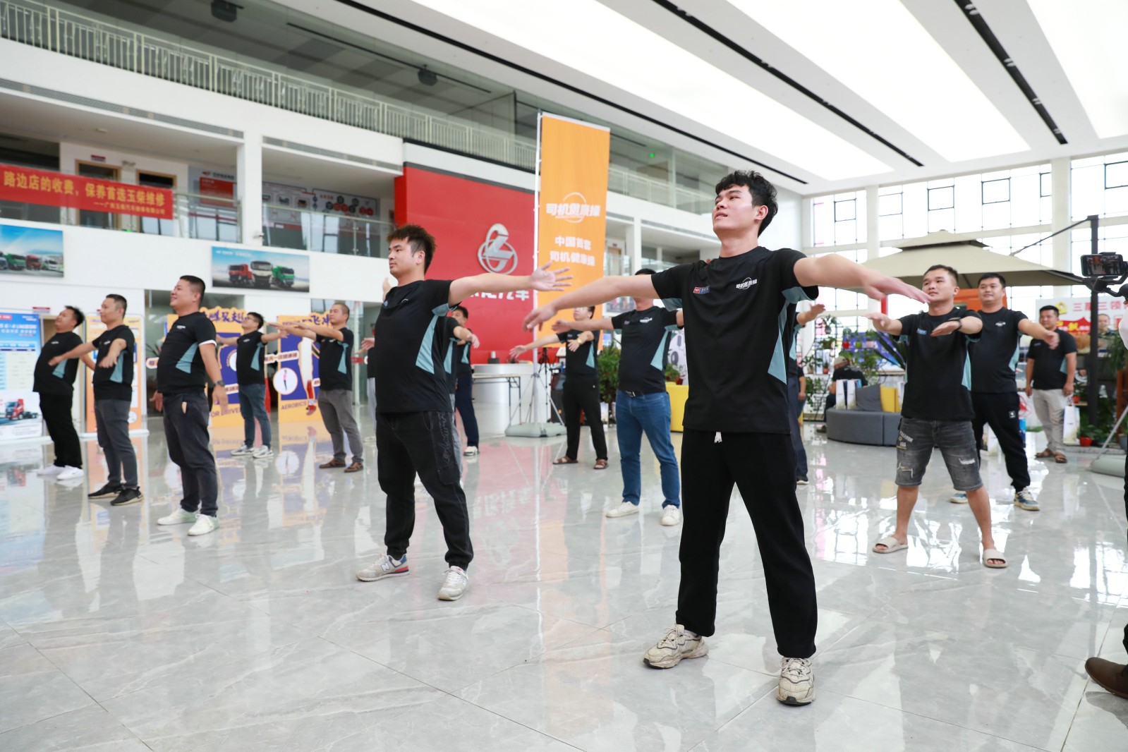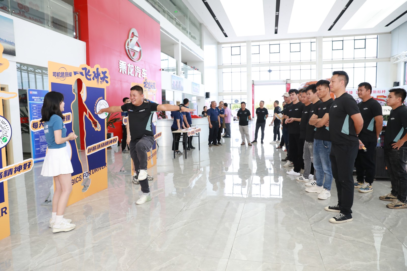 隨后,司機(jī)朋友觀看了司機(jī)健康操主題視頻和初衷視頻,進(jìn)一步加深了大家對(duì)司機(jī)健康操的了解。在實(shí)操體驗(yàn)環(huán)節(jié),司機(jī)朋友踴躍上臺(tái),并在推廣大使的帶領(lǐng)下,認(rèn)真做起了司機(jī)健康操:左右旋轉(zhuǎn)伸展、踮腳雙臂后伸、臂平展單腿站……全場(chǎng)笑聲朗朗,熱鬧非凡。